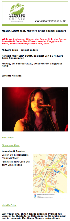 An diesem speziellen Abend werden 11 Sängerinnen aus dem Chor MIDWIFE CRISIS Meira Loom stimmlich begleiten. Es erwarten die Zuschauer unkonventionelle Arrangements, wo die Grenze zwischen Publikum und Musizierenden nicht immer klar unterschieden werden kann.